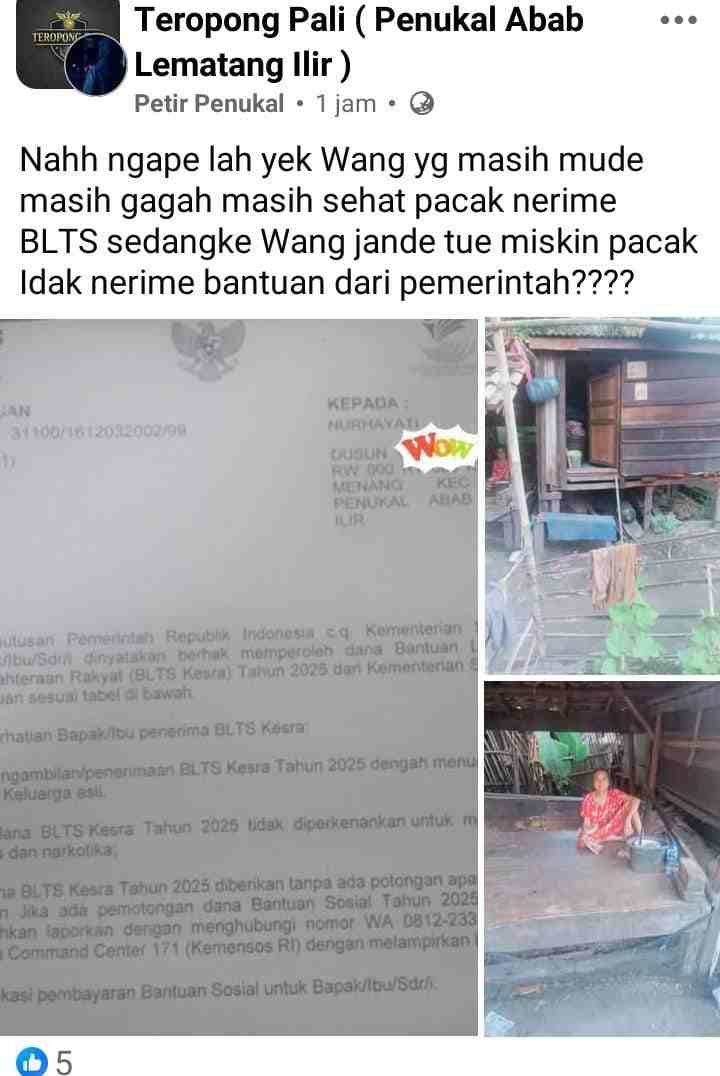 Temuan ini yang telah viral di media sosial di grub berita pali-Tropong Pali ,”Nah ngapelah yek wang yang masih mude masih gagah masih sehat pacak nerime BLTS sedangke Wang jande tue miskin pacak ide nerime bantuan dari pemerintah,”?